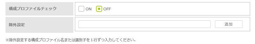 | 構成プロファイルチェック | 構成プロファイルチェックを行う場合は、「ON」を選択します。 初期設定は「OFF」(チェックしない)になっています。 |