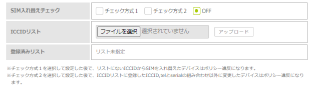 | SIM入れ替えチェック | SIM入れ替えチェックを行う場合は、「チェック方式1」もしくは「チェック方式2」を選択します。 初期設定は「OFF」(チェックしない)になっています。 「チェック方式1」を選択した場合は、登録したCSVファイルにないICCIDからSIMを入れ替えたデバイスはポリシー違反になります。 「チェック方式2」を選択した場合は、登録したCSVファイルのシリアル番号と電話番号およびICCIDの組み合わせ以外のデバイスはポリシー違反になります。また、違反となる対象はCSVファイルに記載されたシリアル番号のデバイスになります。 SIMの入れ替えを検知した際は、「SIM変更検知」ステータスアイコンが表示されます。 2021年3月20日より前に「ON」を選択して設定したポリシーは、「チェック方式1」が選択された状態になっています。 |