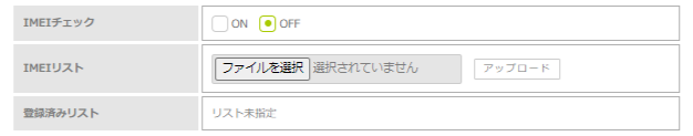 | IMEIリスト | IMEIを記載したCSVファイルを登録します。 「IMEIチェック」を「ON」に設定した場合に、「参照」ボタンをクリックし、IMEIを記載したCSVファイルを選択して、「アップロード」ボタンをクリックします。アップロードすると、CSVファイル名が表示されます。 IMEIリストは、最大1000件まで登録できます。 |