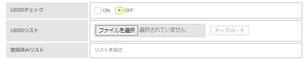 | UDIDチェック | UDIDチェックを行う場合は、「ON」を選択します。 初期設定は「OFF」(チェックしない)になっています。 |