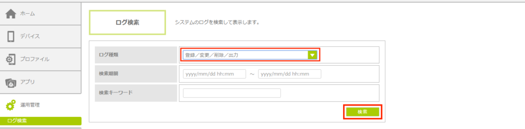 2.「ログ種類」で「登録/変更/削除/出力」を選択し、「検索」ボタンをクリックします。