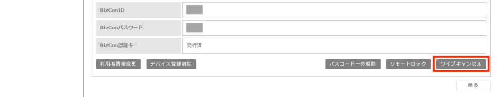 ・リモートワイプの実行を指示した後、リモートワイプが実行されるまでの間は、「ワイプキャンセル」ボタンが表示されます。