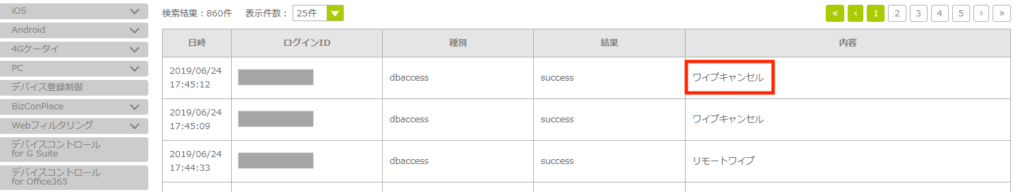 キャンセルされず、リモートワイプが実行された場合、「種別」が「EraseDevice」のデバイスに対して、「結果」が「success」と表示されます。