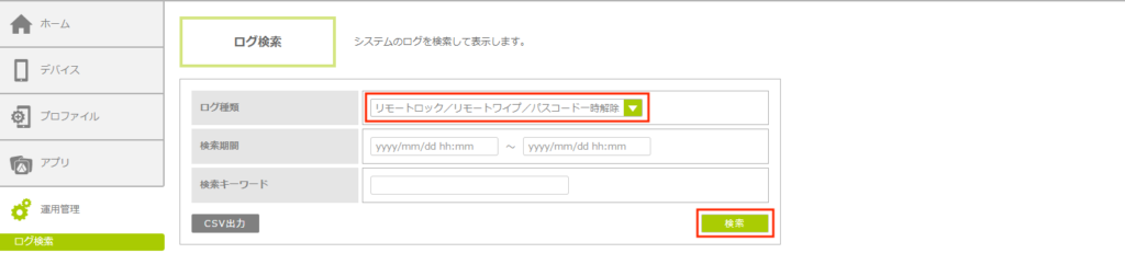 4.「ログ種類」で「リモートロック/リモートワイプ/パスコード一時解除」を選択し、「検索」ボタンをクリックします。