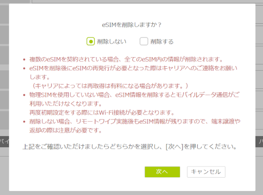 | <DMコードがM6から始まるお客様> ・最新のデバイス情報にeSIMの情報が含まれていた場合、「リモートワイプ」ボタンをクリックすると、eSIMのデータを削除するかどうかを選択するポップアップが表示されます。注意事項をご確認いただき、いずれかの選択肢を選択してください。 ![]() ・電波状況などにより、eSIMを使われているデバイスであっても、ポップアップが表示されない場合があります。また、eSIMを使われていないデバイスであっても、ポップアップが表示される場合があります。 ・ポップアップで「削除しない」を選択した場合、およびポップアップが表示されなかった場合は、eSIMのデータは削除されません。 ・eSIMデータを削除するモードでリモートワイプを実行しても、eSIMを使われていないデバイスには影響がありません。 ・eSIMデータの削除は「ログ検索」画面で確認できます。eSIMデータを削除するモードでリモートワイプを実行した場合、ログ種類「登録/変更/削除/出力」で出力されるリモートワイプログの「内容」に(eSIM:削除する)が表示されます。ログ検索については、「7.2.1. 管理サイトで実行された操作ログを確認する」を参照してください。 |