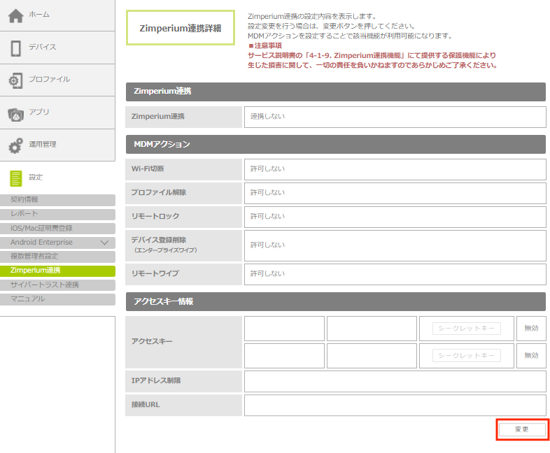 | アクセスキー | Zimperium、CybereasonMTDと連携するためのアクセスキーとシークレットキーを発行します。最大2つ発行できます。 アクセスキーを有効にするとシークレットキーが発行され、Zimperium連携が有効になります。