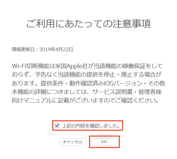 3.表示される「ご利用にあたっての注意事項」の内容を確認し、「上記の内容を確認しました。」にチェックを入れて、「OK」ボタンをクリックします。