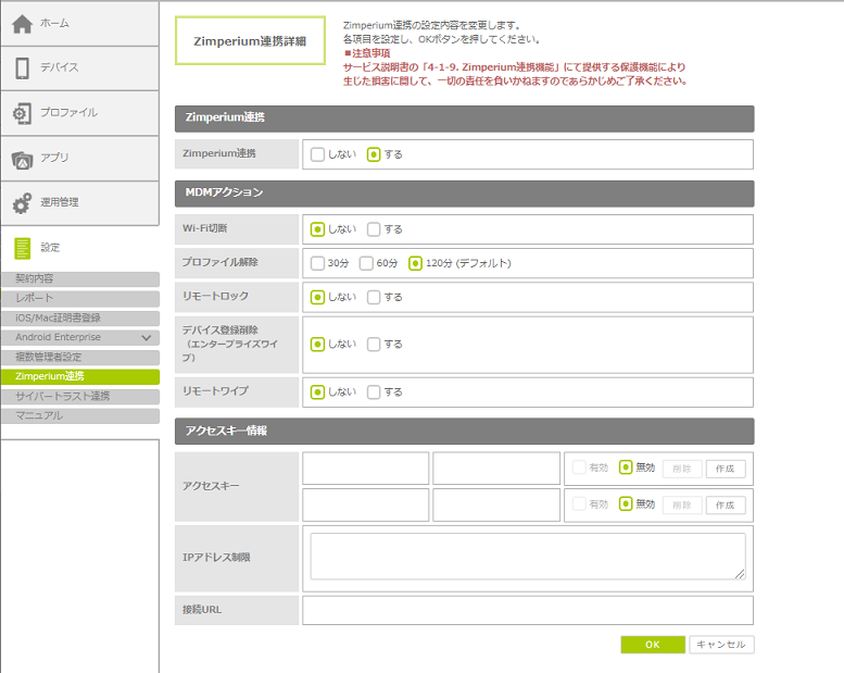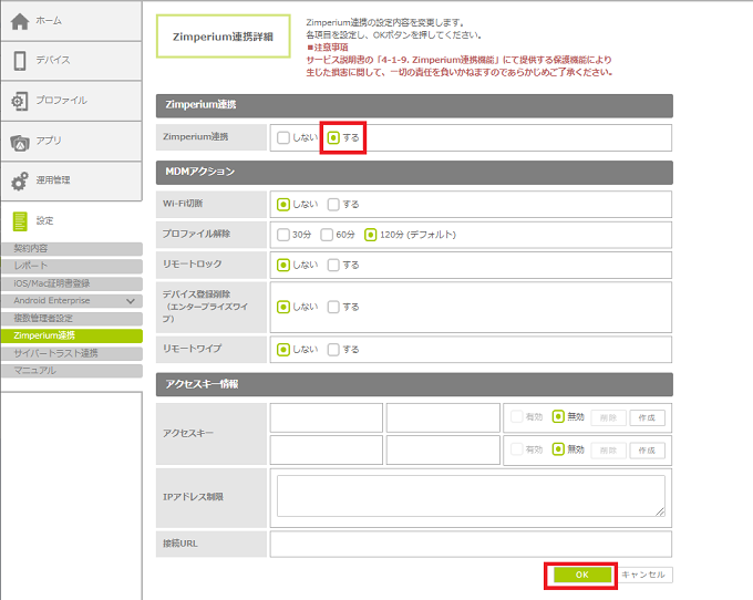 4.「Zimperium連携」で「する」を選択し、各項目を設定して、「OK」ボタンをクリックします。