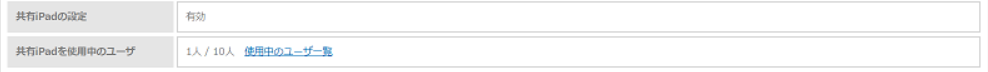 共有iPad の設定がされている場合、共有iPad を使用中のユーザ数と、共有iPad 上に同時に保存できる最大ユーザ数、使用中のユーザの詳細情報画面へのリンクが表示されます。