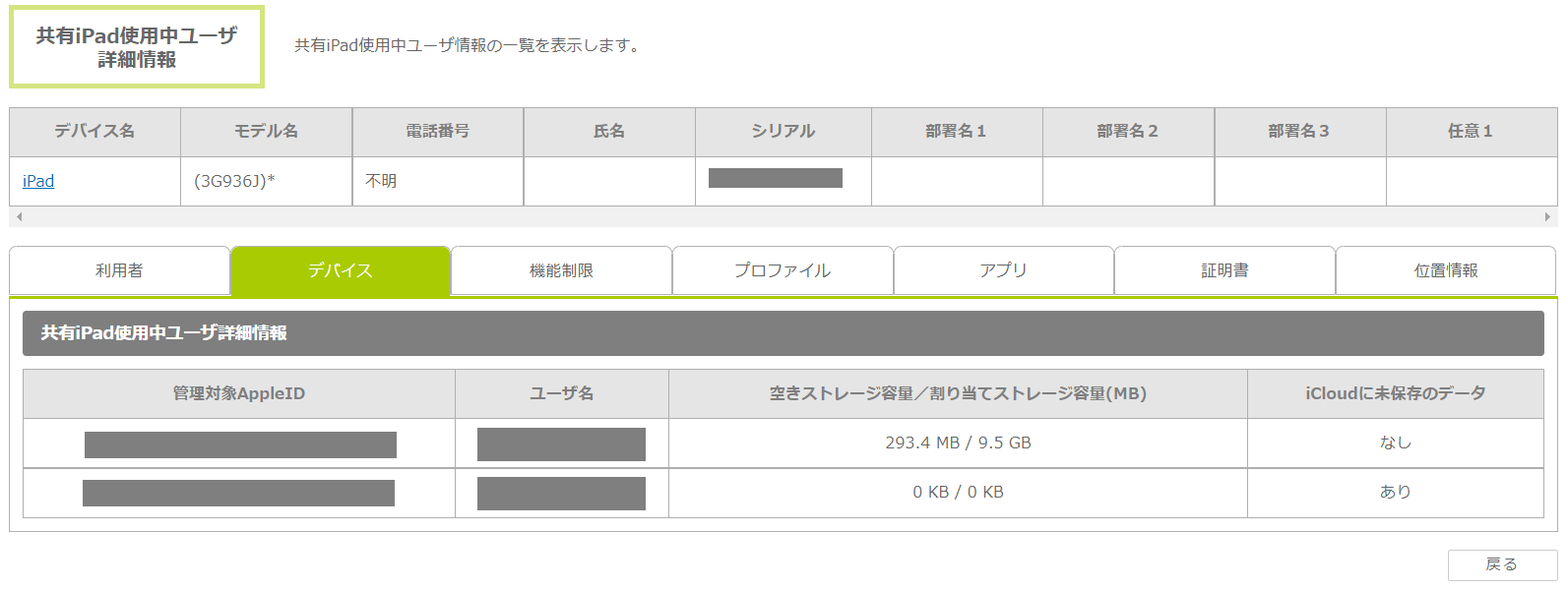 ・情報取得時の状況により、共有iPad から管理対象AppleIDのストレージ利用状況に関する情報が取得されないことがあります。その場合、容量の値はどちらも0 KBで表示されます。