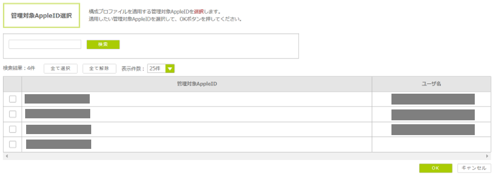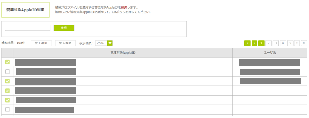 構成プロファイル登録時に選択した管理対象AppleIDはチェックが入った状態で表示されます。登録変更では、登録時に選択した管理対象AppleIDを選択解除することはできません。管理対象AppleIDに登録した構成プロファイルを解除したい場合は、プロファイル解除を行ってください。プロファイル解除の手順については「管理対象AppleIDに対して登録した構成プロファイルを解除する」を参照してください。