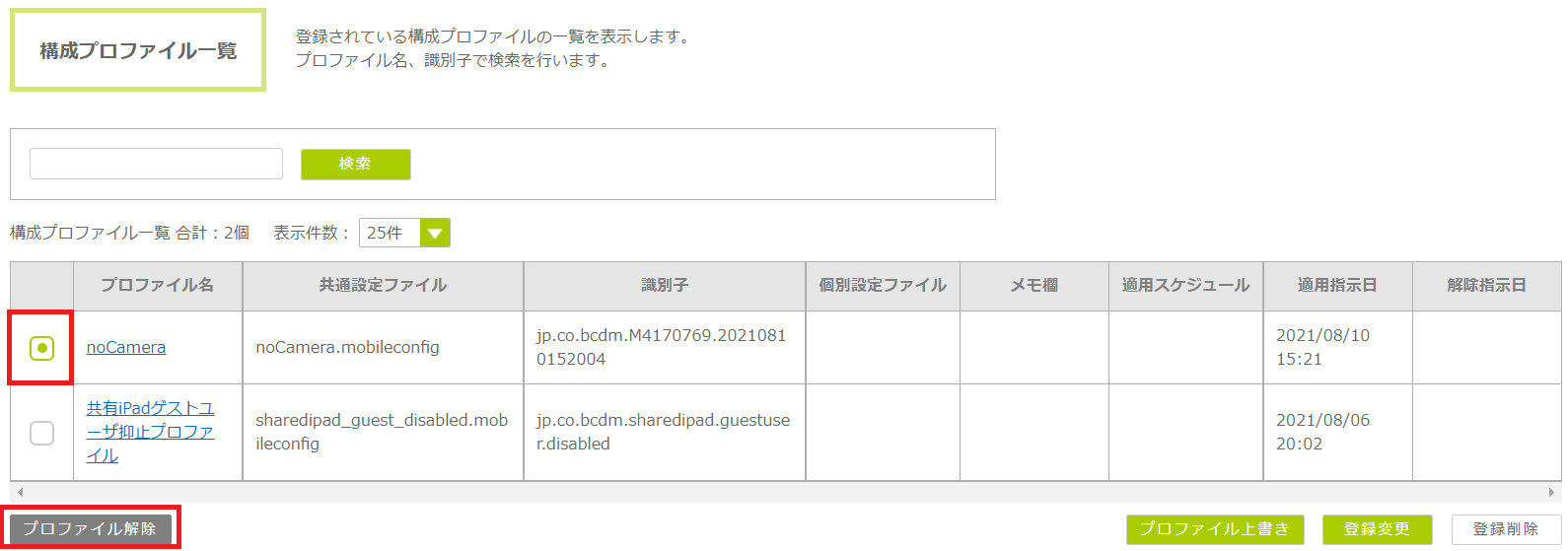 2.変更する構成プロファイルを選択し、「プロファイル解除」ボタンをクリックします。