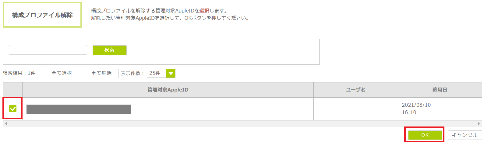3.解除したい管理対象AppleIDを選択し、「OK」ボタンをクリックします。