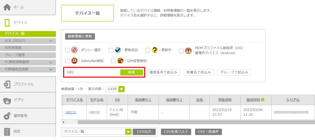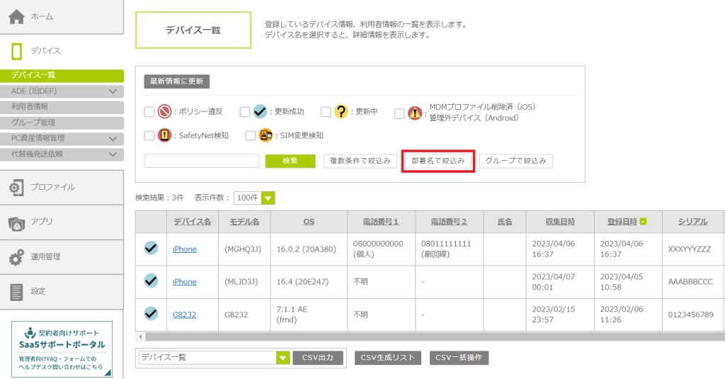指定した部署名に該当するデバイスが一覧表示されます。