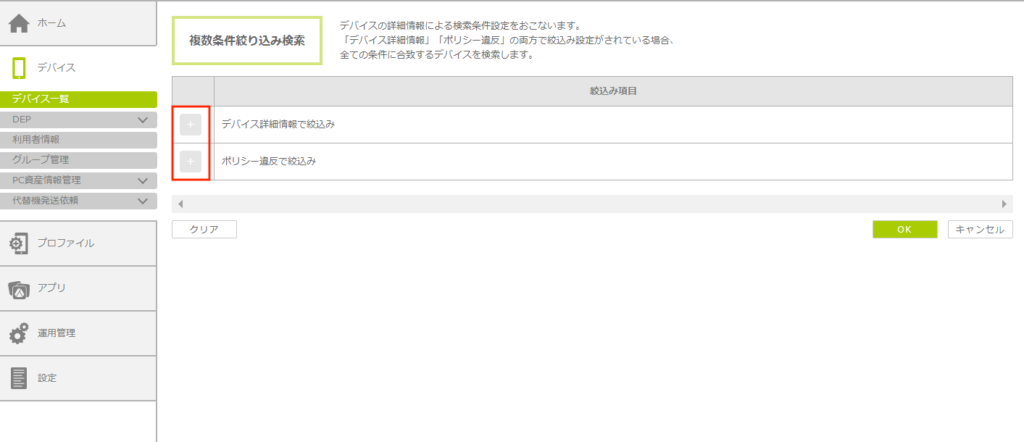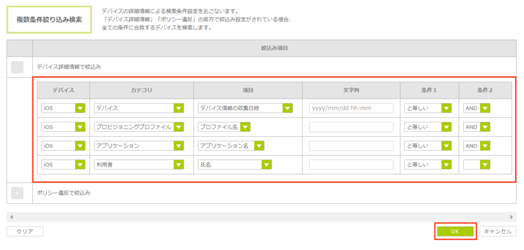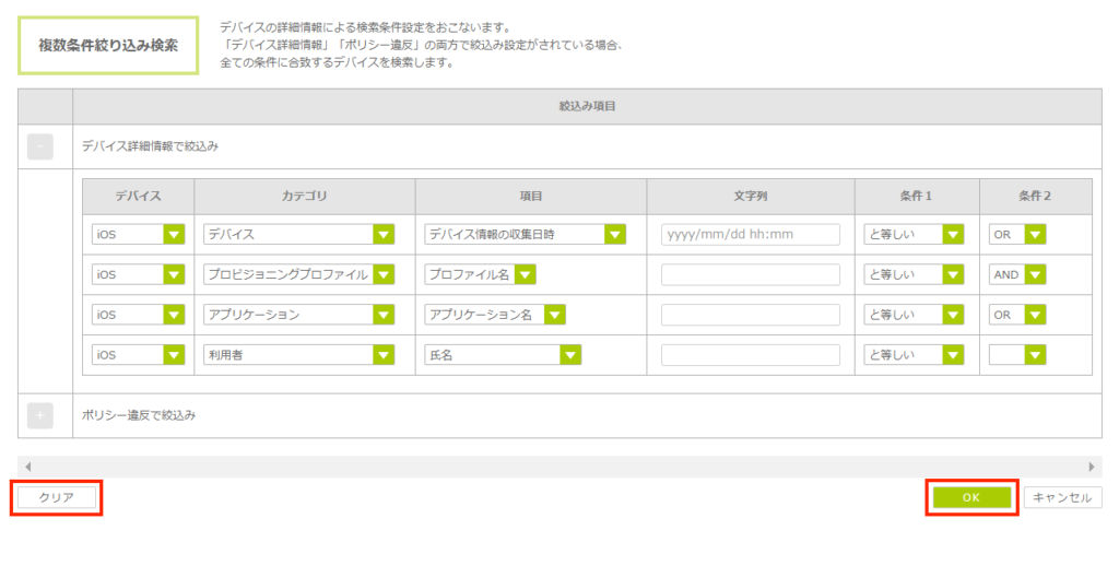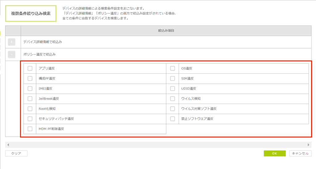 - デバイス詳細情報/ポリシー違反で検索した後に、再度「複数条件で絞込み」ボタンをクリックし、「クリア」ボタン、「OK」ボタンの順にクリックする。
