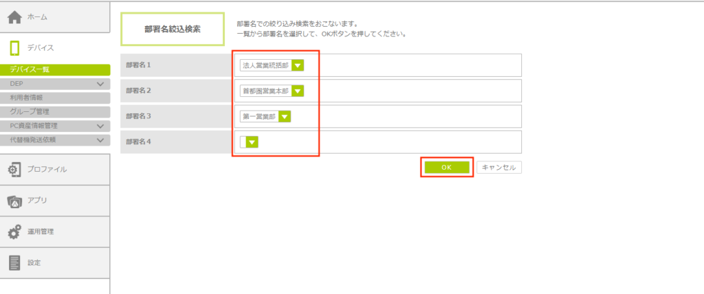 利用者の部署名を指定して、表示されるデバイスを絞り込むことができます。