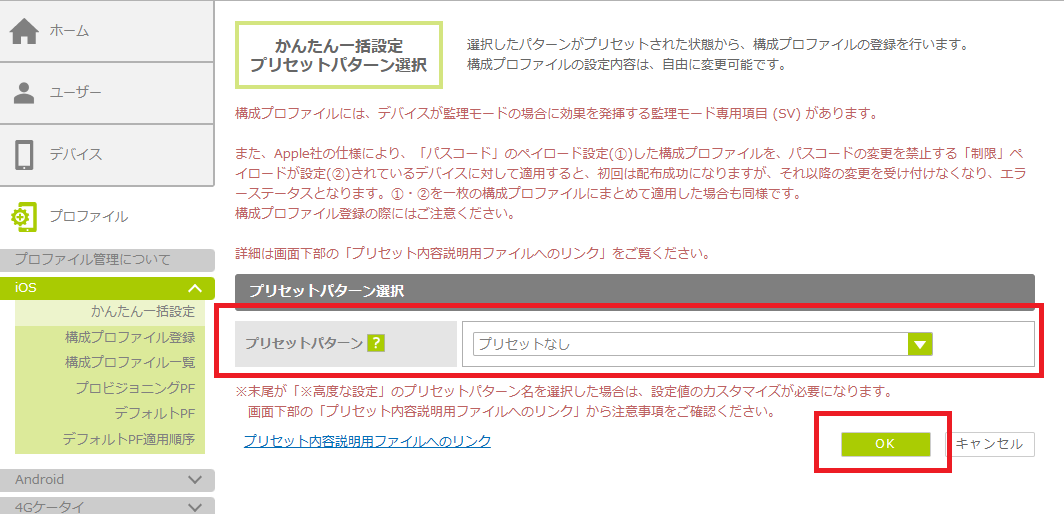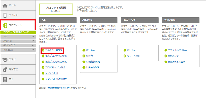 1.「プロファイル」をクリックし、「iOS」の「かんたん一括設定」をクリックします。