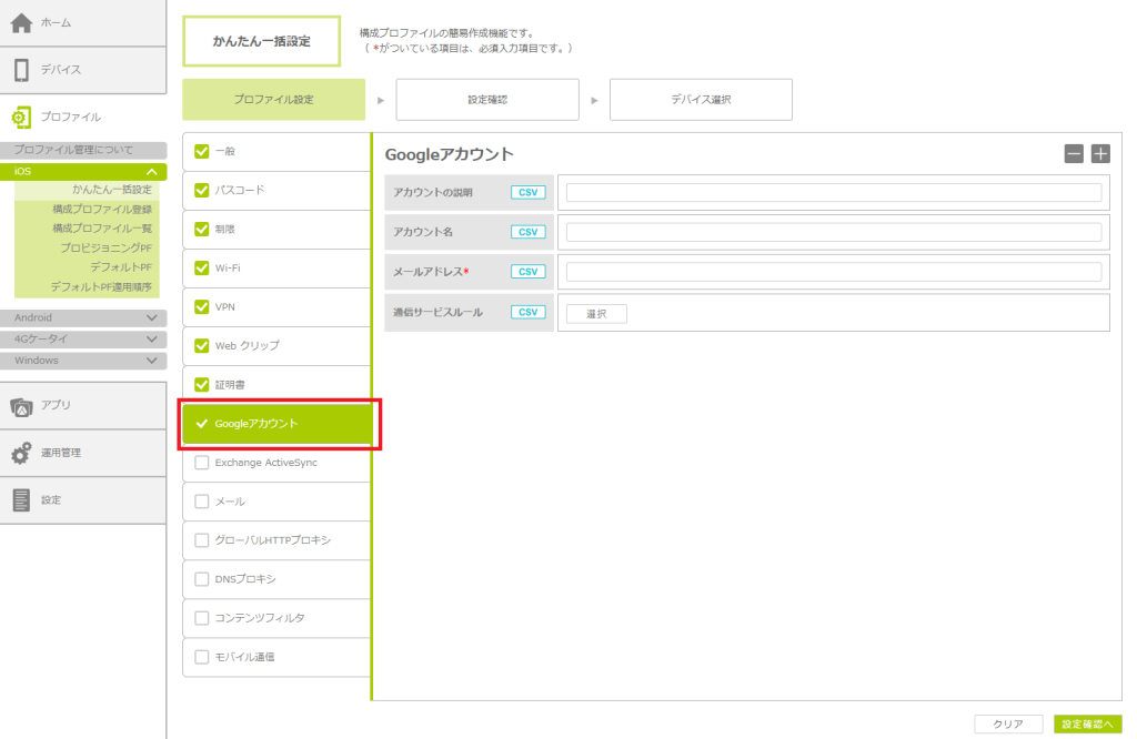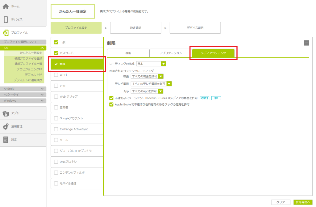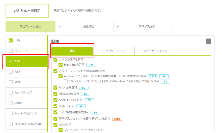 | かんたん一括設定 | 「かんたん一括設定」とは、Apple Configuratorを使わなくても、構成プロファイルを作成できるBCDMの機能です。 「かんたん一括設定」では、パスコード、機能制限、Wi-Fi設定、VPN設定、Webクリップ、証明書、Googleアカウント、 Exchange ActiveSync、メール、グローバルHTTPプロキシ、DNSプロキシ、コンテンツフィルタ、モバイル通信を作成できます。