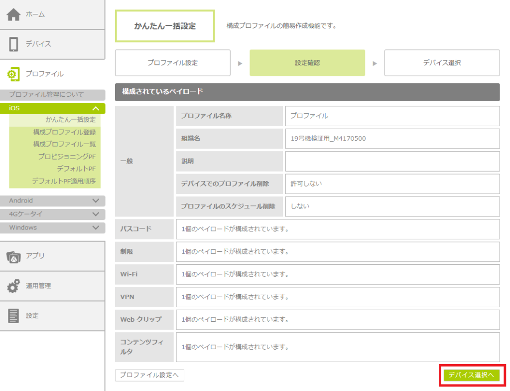 6.設定内容を確認し、「デバイス選択へ」ボタンをクリックします。