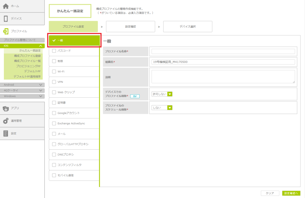 | デバイスでのプロファイル削除 |