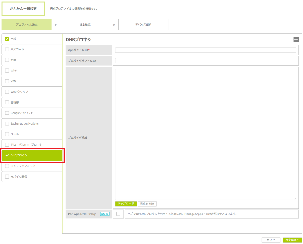 ・デバイス全体に対するDNSプロキシ設定と、Per-App DNS Proxy用のDNSプロキシ設定を混在させると、正常にDNSプロキシが動作しないことがあります。 ・iOS 16.0以降のデバイスが対象です。 |