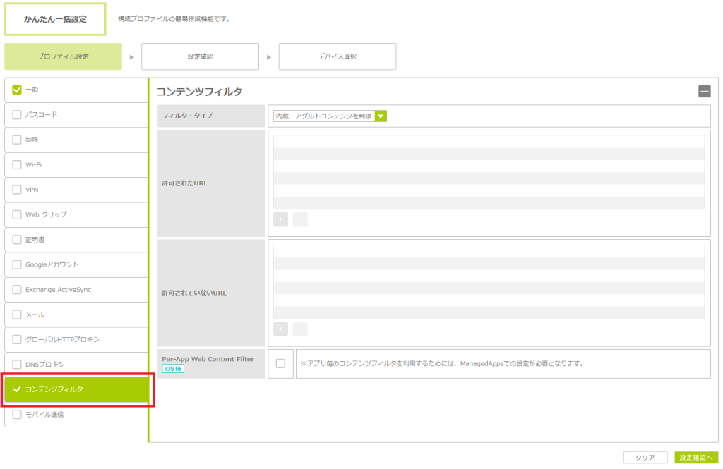 ・Per-App Web Content Filterを設定したアプリを配布できる数は、1デバイスにつき7アプリまでとなっております。 ・iOS 16.0以降のデバイスが対象です。 |