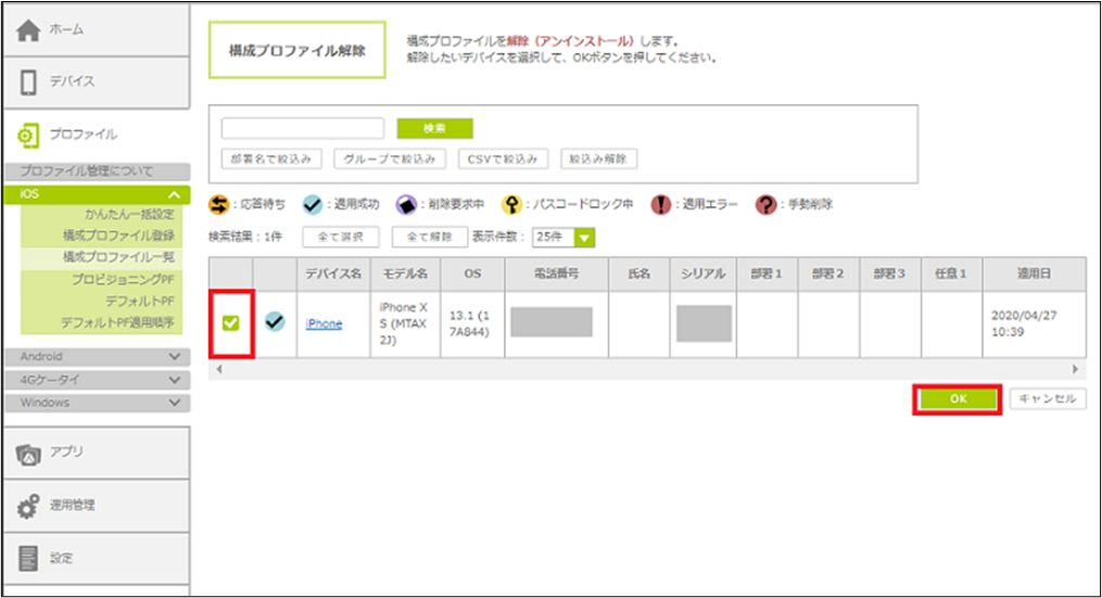 3.構成プロファイルを解除したいデバイスを選択し、「OK」ボタンをクリックします。