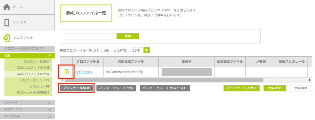 2.解除したい構成プロファイルを選択し、「プロファイル解除」ボタンをクリックします。