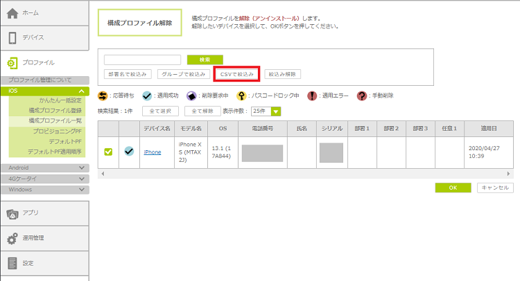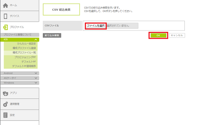「構成プロファイル一覧」画面でCSVファイルを指定し、対象デバイスを検索して一括で解除します。