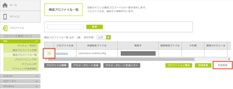 「構成プロファイル一覧」画面で対象デバイスを選択して解除します。