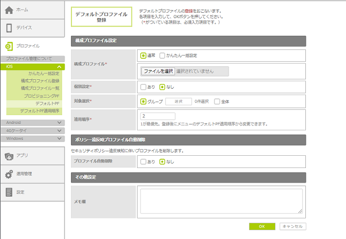 作成した構成プロファイルを「デフォルトプロファイル」として管理サイトに登録しておくことで、新規デバイスの登録時などに、該当の構成プロファイルを自動的に配信することができます。