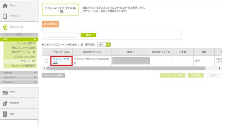 1.「プロファイル管理」をクリックし、「iOS」の「デフォルトPF」をクリックします。