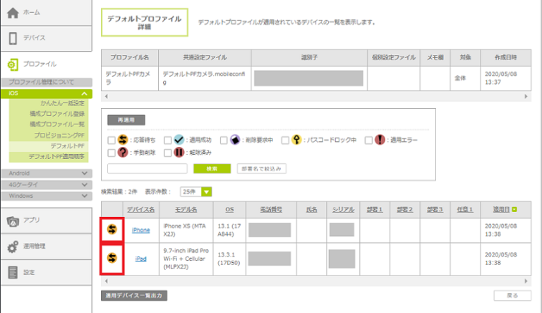 3.対象デバイスのステータスアイコンで、デフォルトプロファイルの適用状況を確認します。