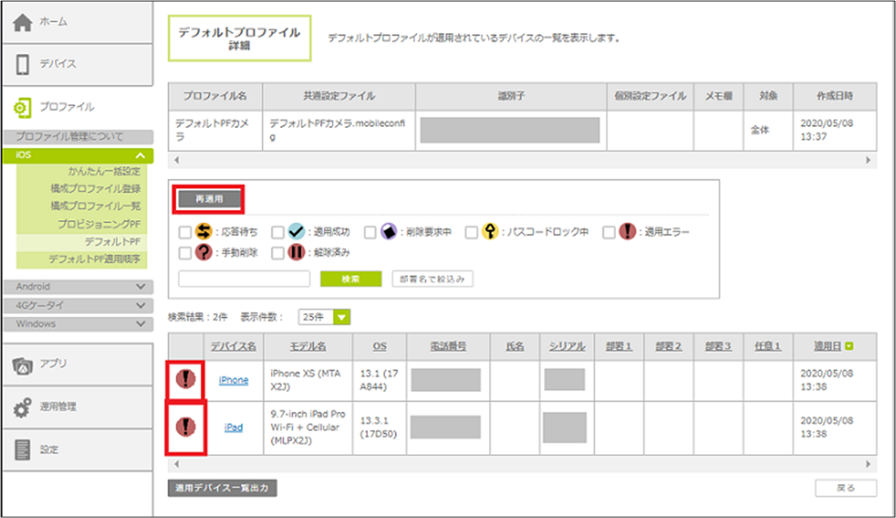 適用エラーとなったデバイスにデフォルトプロファイルが再適用されます。