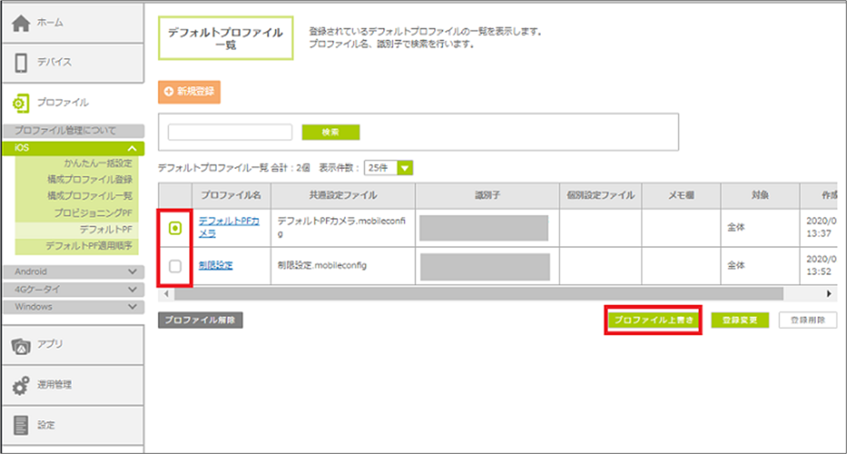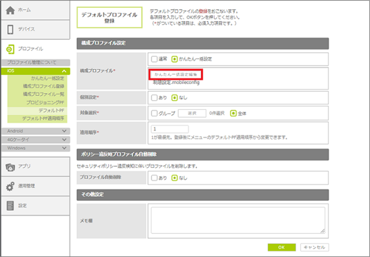 管理サイトに登録済みのデフォルトプロファイルの設定内容を変更します。「かんたん一括設定」を使用して作成した場合は、デフォルトプロファイルの上書きではなく、管理サイト上に登録されている設定内容を変更します。