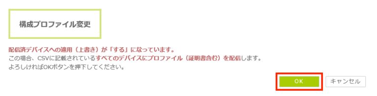 個別設定CSVファイルを利用する場合 ・プロファイルの設定内容を変更する画面の「配信済デバイスへの適用」で「する」を選択すると、個別設定CSVファイルに記載されている全てのデバイスに対して、デフォルトプロファイルが再適用されます。以下の画面が表示されますので、再適用しても問題がなければ「OK」ボタンをクリックします。
