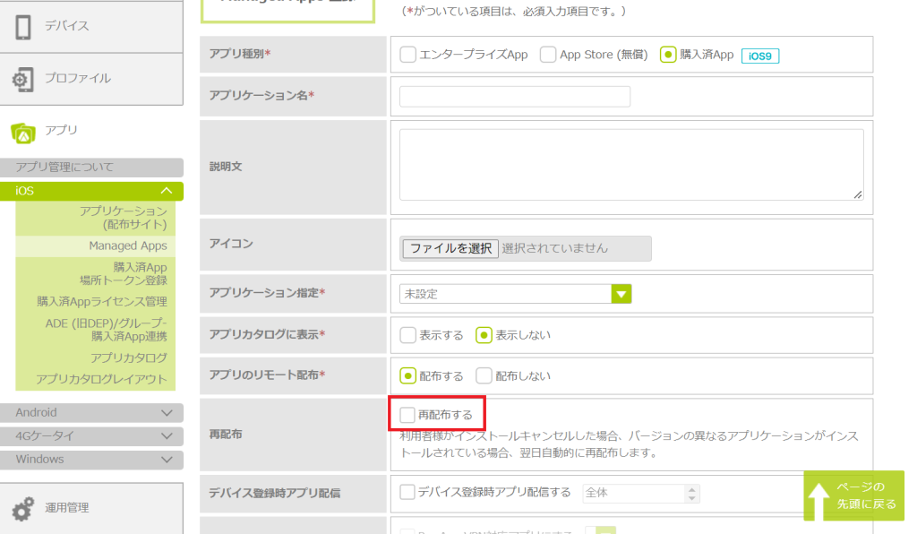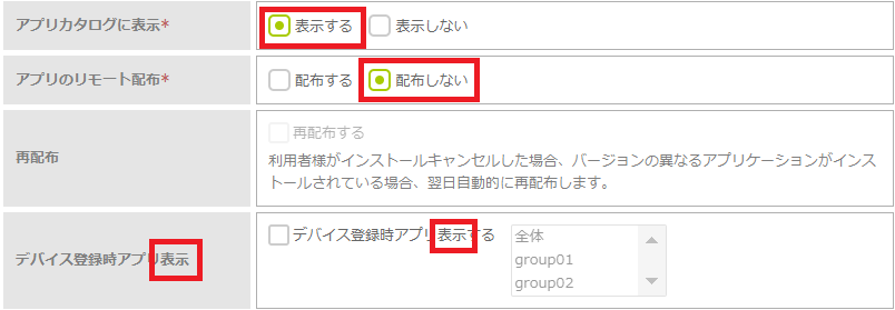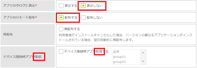 | 再配布 | アプリの再配布を行う場合にチェックを入れます。再配布を設定すると、配布したアプリのインストールを利用者がキャンセルしても、翌日自動的に再配布します。 |