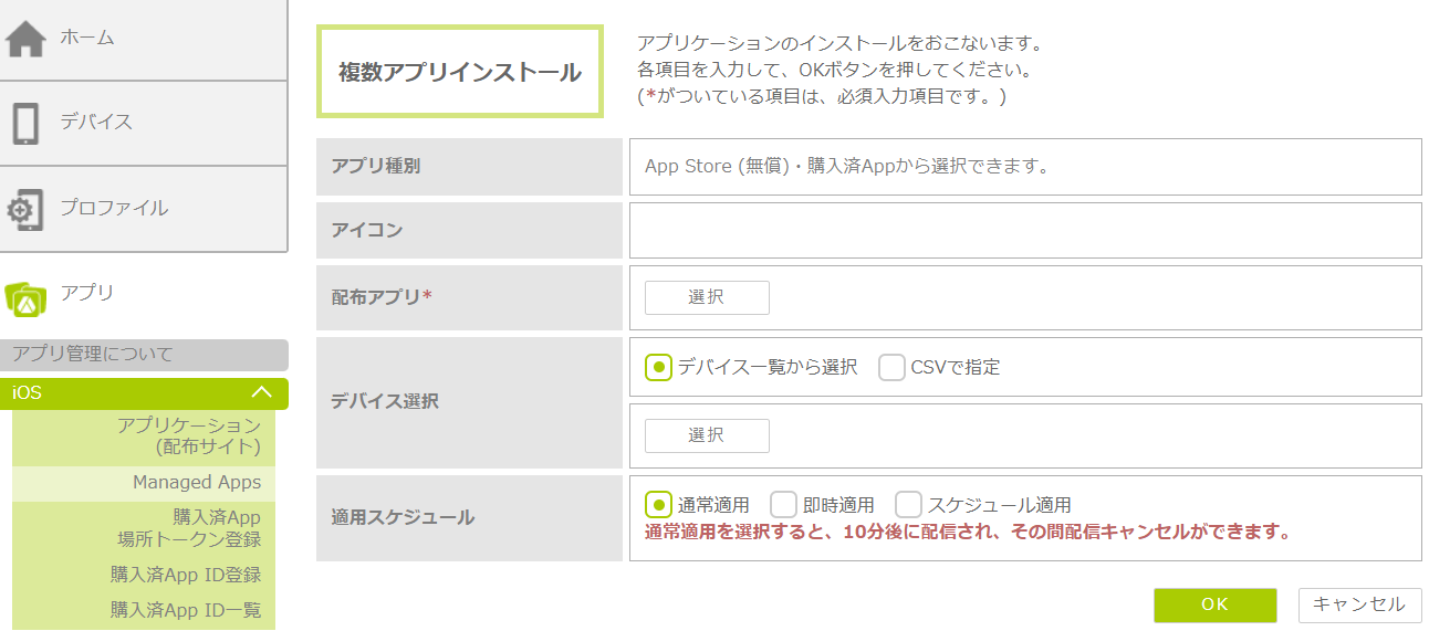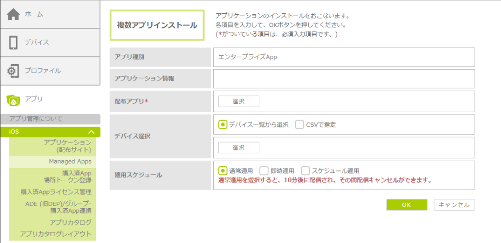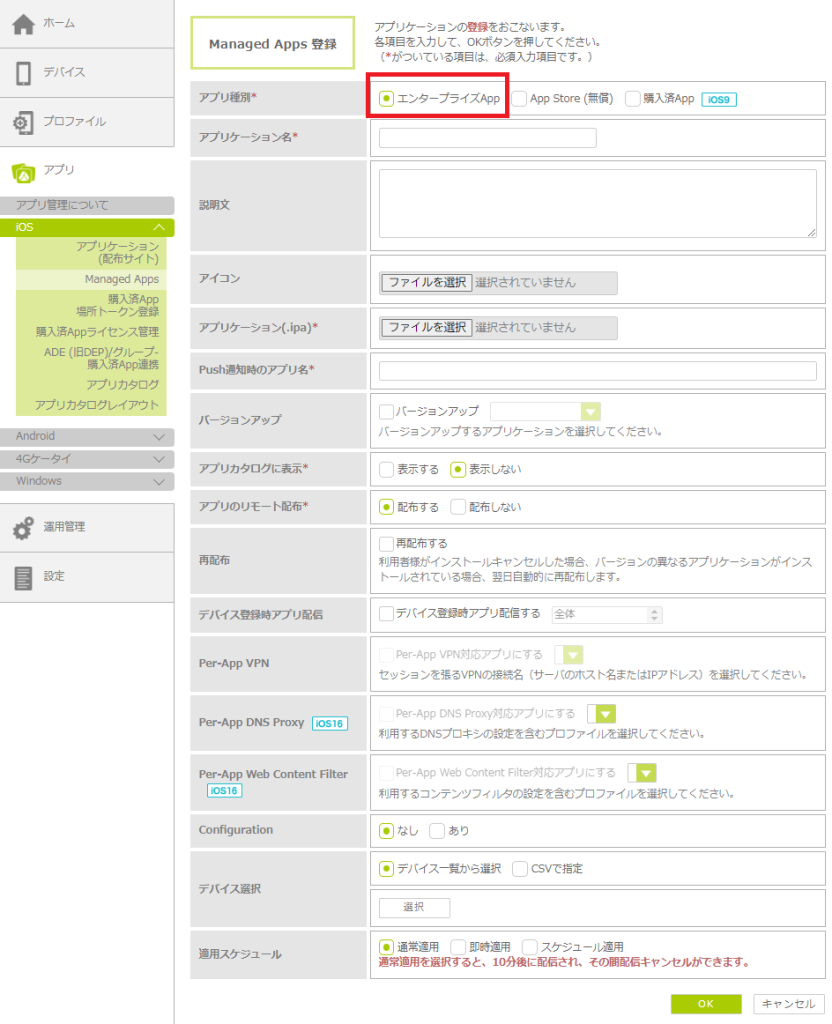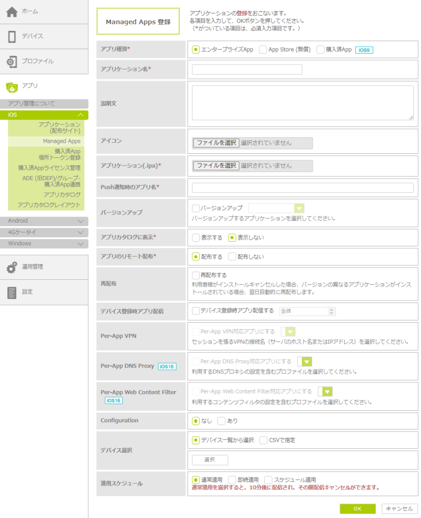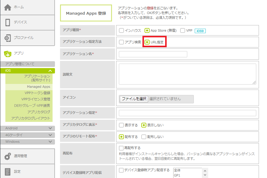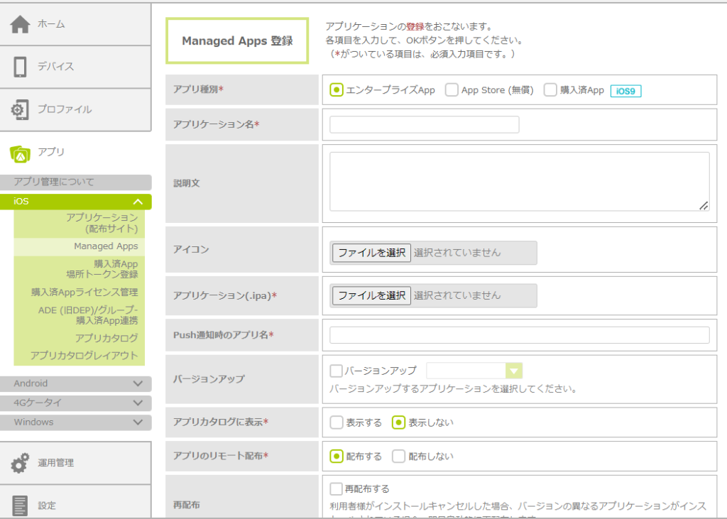 配布するアプリを管理サイトに登録し、iOSデバイスにインストール通知を行ってリモート配布します。アプリの種別によって、登録時の設定項目が異なります。