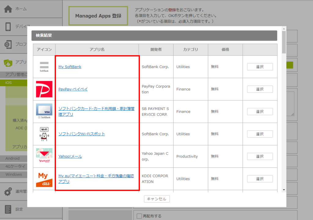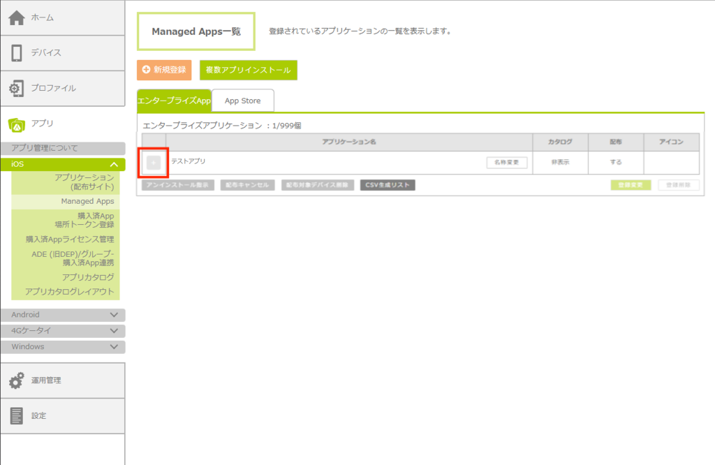 「Managed Apps一覧」画面が表示されます。