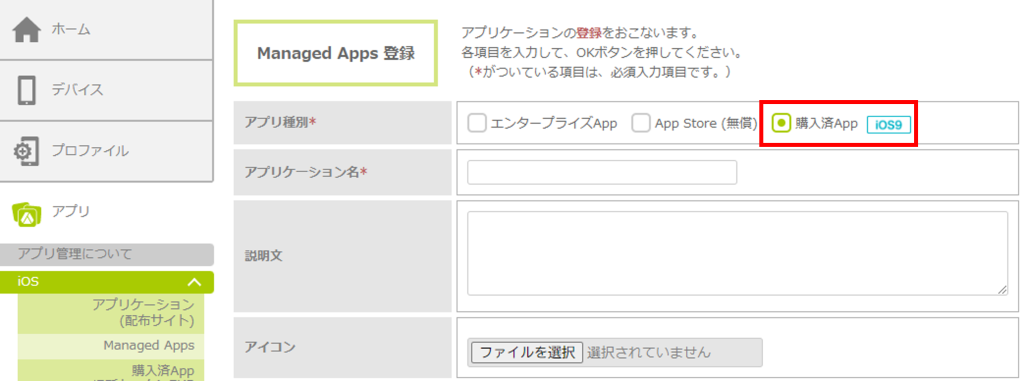 1.「Managed Apps登録」画面を表示し、「アプリ種別」で「購入済App」を選択します。