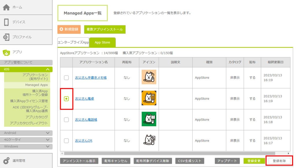 2.登録削除したいアプリを選択し、「登録削除」ボタンをクリックします。