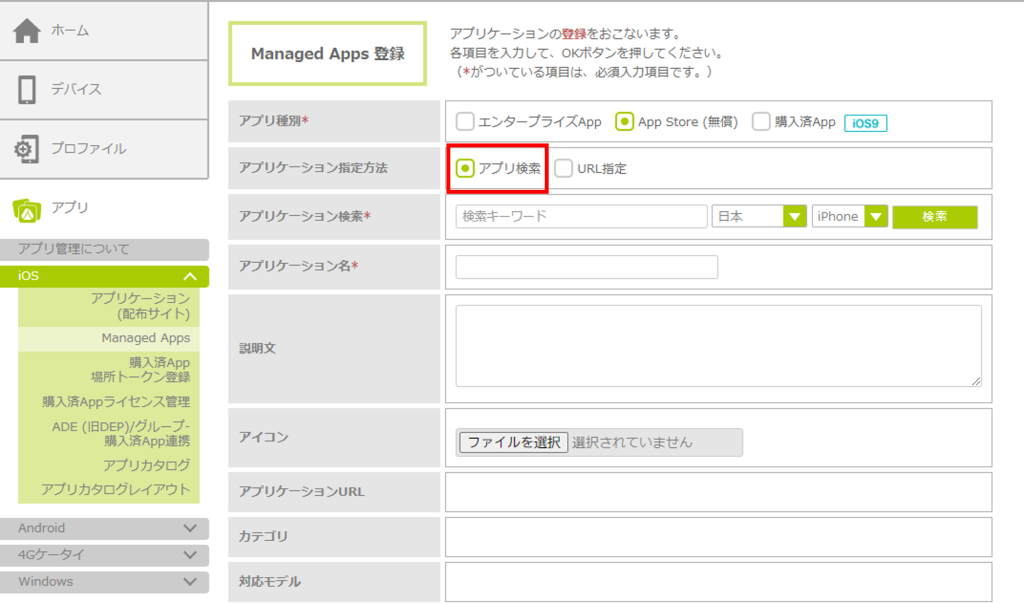 | アプリケーション名 | アプリの名前を入力します。Managed Apps一覧に表示されます。 |