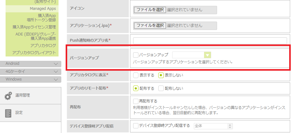 | バージョンアップ | エンタープライズAppの場合のみ表示される項目です。 登録するアプリが、既存のアプリのバージョンアップ版である場合にチェックを入れます。該当のアプリを選択します。 |