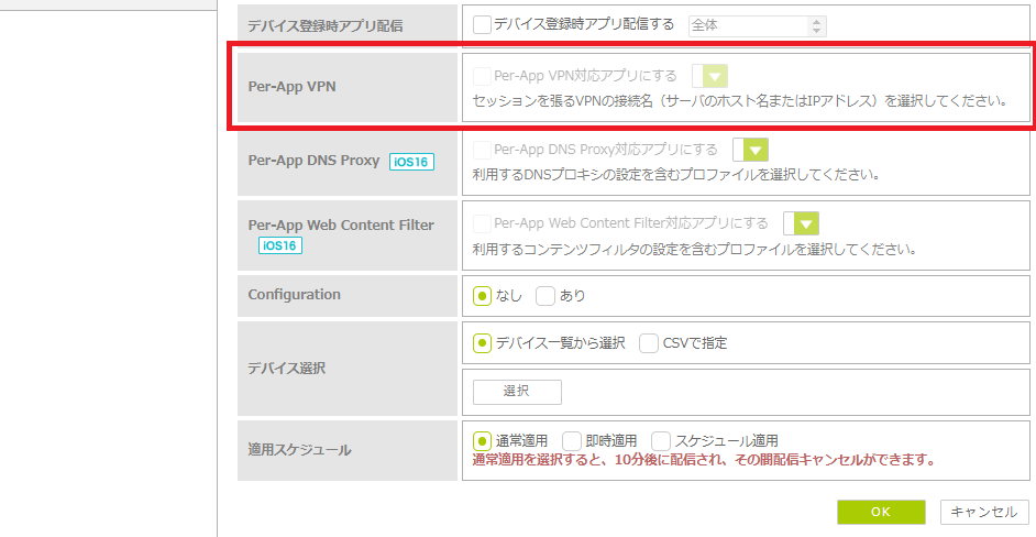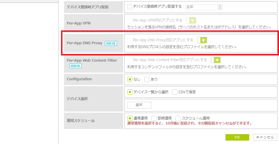 ・iOS 16.0以降のデバイスが対象です。 ・使用するDNSプロキシがPer-App DNS Proxyに対応しているかは、DNSプロキシベンダにお問い合わせください。 ・Per-App DNS Proxyを使用するアプリがPer-App DNS Proxyに対応しているかは、アプリベンダにお問い合わせください。 ・Per-App DNS Proxyを利用するには、事前に「かんたん一括設定」で作成したPer-App DNS Proxy用のプロファイルをデバイスに適用する必要があります。 |