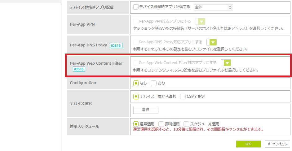 ・Per-App Web Content Filterを設定したアプリを配布できる数は、1デバイスにつき7アプリまでとなっております。 ・Per-App Web Content Filterにチェックを入れて、プルダウンから選択したプロファイルを削除すると、Per-App Web Content Filterを使用できなくなります。