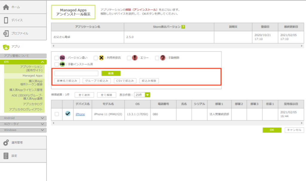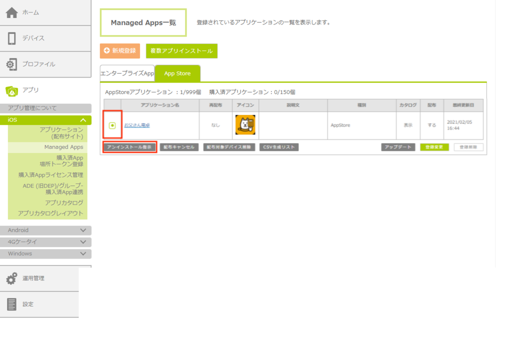 Managed Appsで配布したアプリケーションは、管理サイトからリモートで強制的にアンインストールできます。アプリケーションの配布状態(ステータス)によらず、全てのデバイスに対して実施可能です。