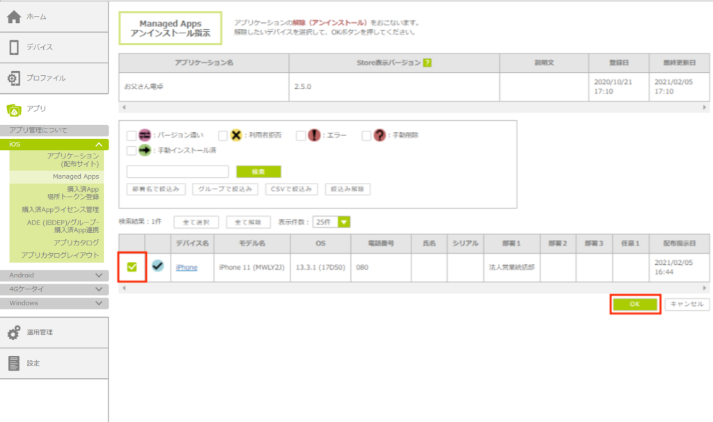 5.アンインストール指示を行ったアプリケーションの「Managed Apps配布状況詳細」画面で、対象デバイスが削除されていることを確認します。
