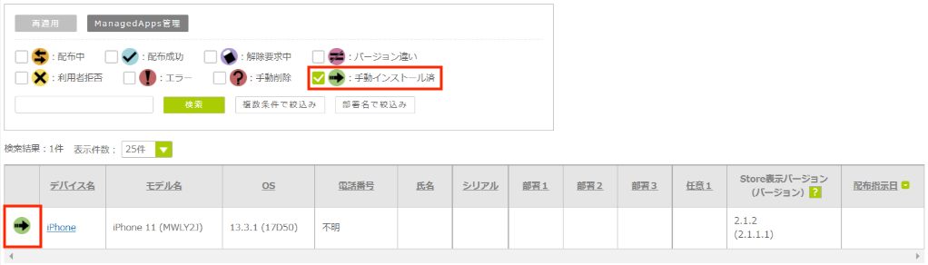 5.対象デバイスの配布状況が「 」となっていることを確認し、アイコン一覧の「 :手動インストール済」をチェックします。