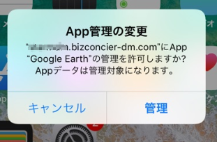 ・デバイスが監視モードになっていない場合、「App管理の変更」のポップアップが表示されます。「キャンセル」をタップすると、Managed Apps配布状況詳細画面は「利用者拒否」のステータスになります。