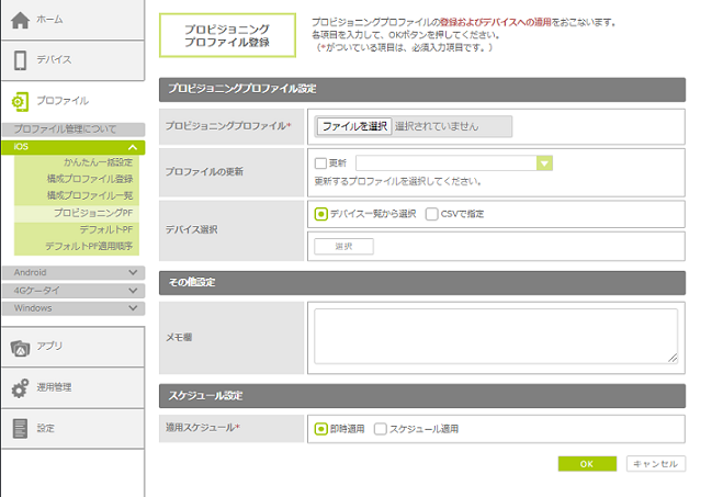 | 適用スケジュール | プロビジョニングプロファイルを配信するスケジュールを指定します。「即時適用」または「スケジュール適用」を選択できます。 |